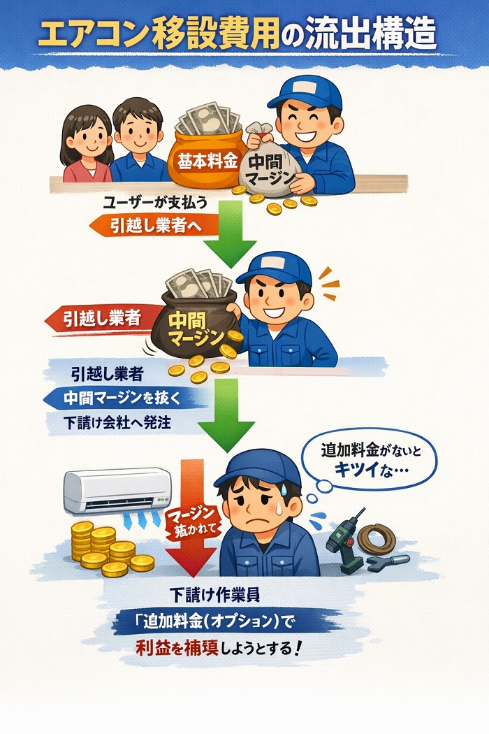 「引っ越し業者から提示されたエアコン移設の見積もりが、当日になって跳ね上がらないか不安だ」