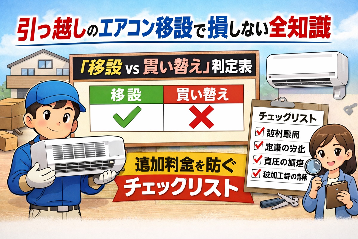 この記事では、元・空調設備士の私が、あなたの財布を守るための「移設vs買い替え判定マトリクス」と、悪徳な追加料金を1円も払わないための「防衛チェックリスト」を公開します。