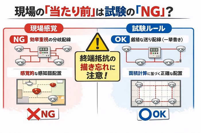 試験で求められるのは「実務上の柔軟な施工」ではなく、「消防法というルールに100%合致した教科書通りの図面」だからです。