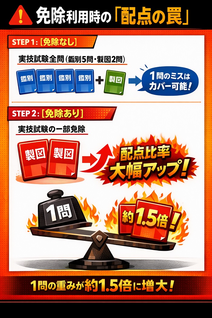 最大の理由は、「実技試験(鑑別・製図)の1問あたりの配点重みが増すこと」にあります。