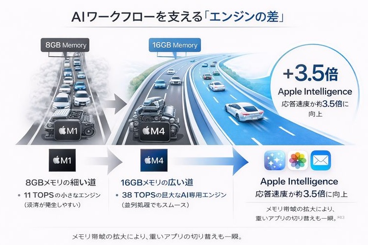 「16GBユニファイドメモリの標準化」と「38 TOPSを誇るNeural Engine(NPU)」の組み合わせです。