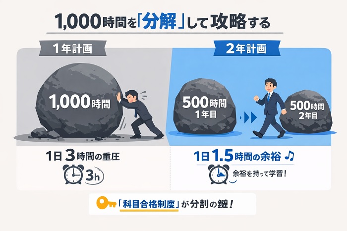 この科目合格制度を活用し、1,000時間を2年間に分散させれば、1年あたりの学習時間は500時間。