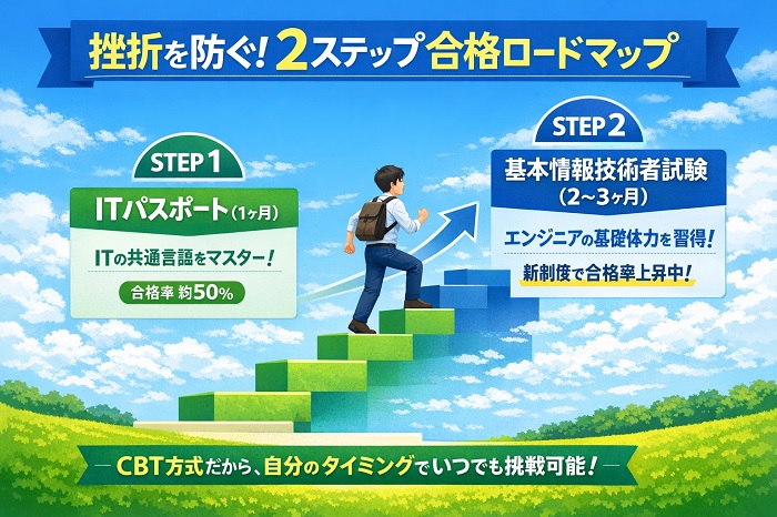 IT未経験の文系初学者が最短で、かつ確実に合格を掴み取るルートは「ITパスポート試験で成功体験を積み、その勢いで新制度の基本情報技術者試験に挑む」という2ステップの逆算戦略です。