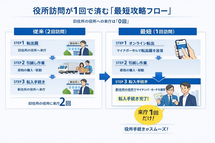 | 役所への訪問回数 | 最低2回(旧住所・新住所) | 1回のみ(新住所のみ) |